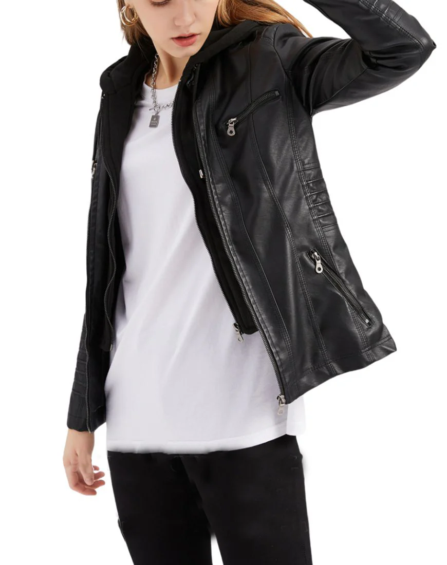 Black Bloom Removable Hooded Leather Jacket