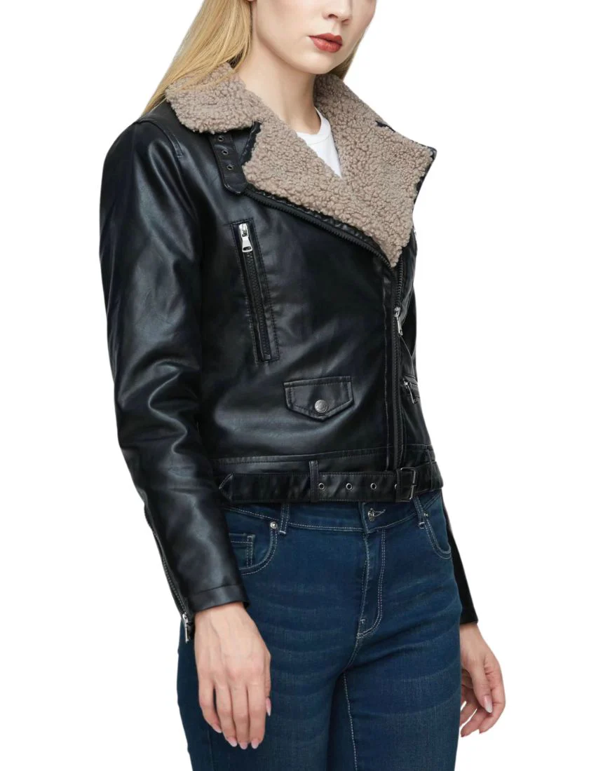 Isla Faux Shearling Black Biker Leather Jacket