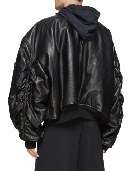 Men’s MA-1 Oversized Leather Black Bomber Jacket With Hood