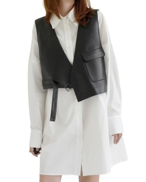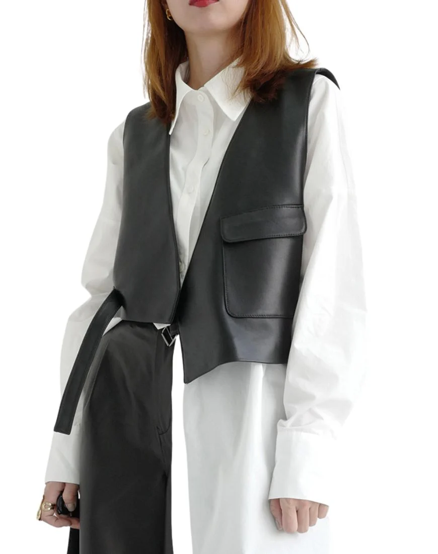 The vest captivates with its inventive shape and impeccably smooth finish, adding an energizing and empowering twist to every ensemble.