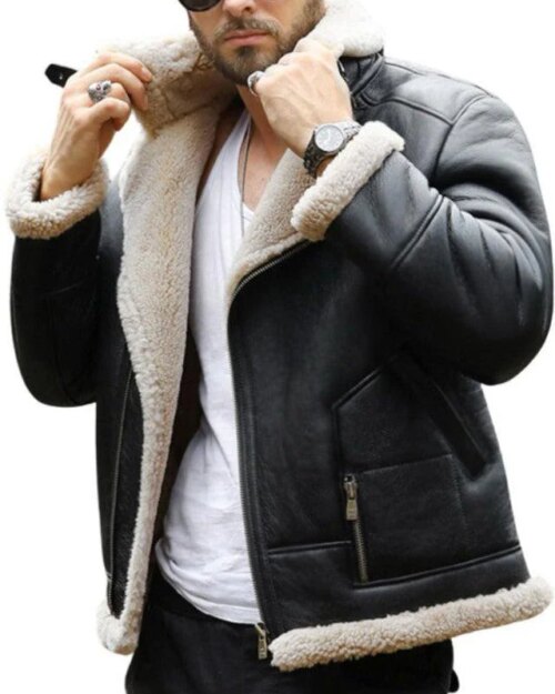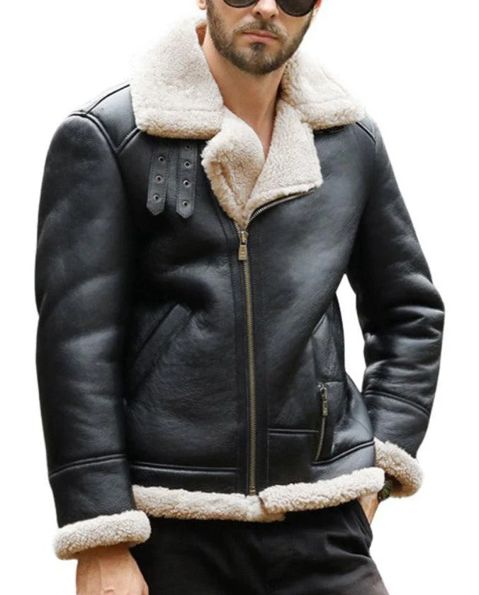 SkyFury Black Leather Bomber Jacket with Faux Shearling Lining