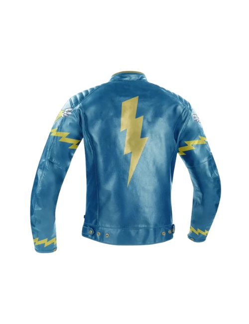 The vibrant blue color and lightning bolt design make this jacket a standout piece.